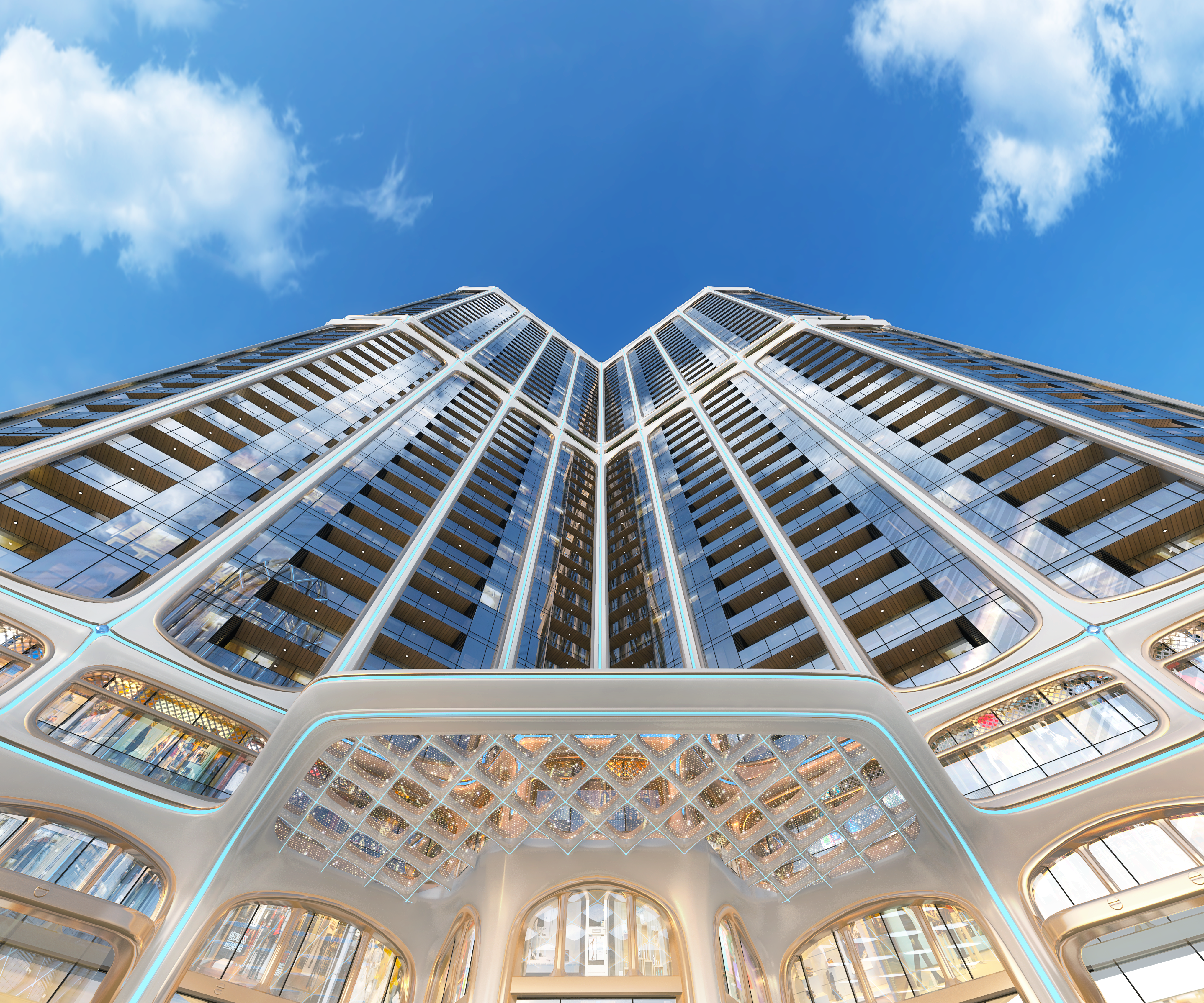 The front of the tower—the bottom “wing” of the Y in this case—is flanked by two drop-off areas for Golden Crown’s commercial and residential sections, which boast pearlescent façades punctuated by gold highlights, colourful LEDs, and sparkling, diamond-patterned ceilings, reinforcing the tower’s flashy, glittering aesthetic.