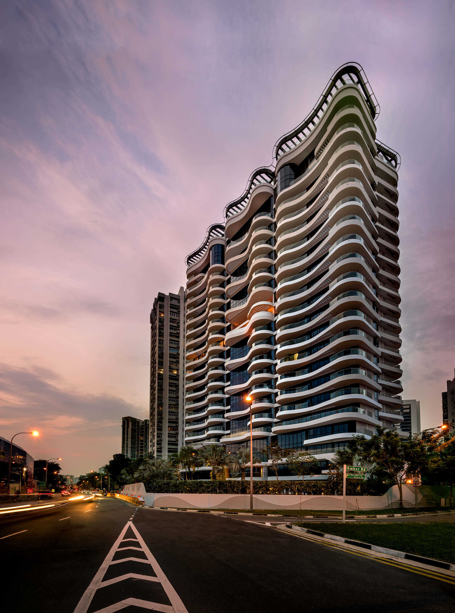 MDL’s solution involved a central service corridor with three units on either side. While the units are generally orthogonal, their rounded corners and curvilinear balconies create a wave pattern, reflecting Amber Skye’s adjacency to the seas. The zig-zagging balconies enhance the building’s dynamic form, giving the impression that each apartment is distinct, while the design suggests that the structure is composed of separate towers. This visual fragmentation softens the building’s mass and enhances natural light and ventilation.