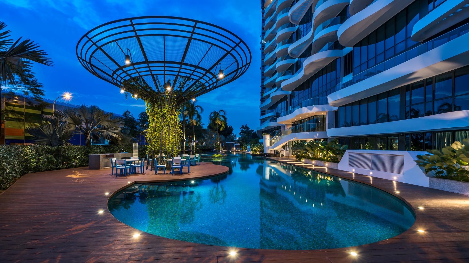 The overall design thus evokes the character of a seaside resort, inspired by the project’s proximity to the sea. The ground floor is set as a semi-basement, allowing for spacious villa units and amenities, including a curvaceous swimming pool, gym, playgrounds, an aqua lounge, and lush landscaping. These elements combine to create a tranquil retreat just 15 minutes from Singapore’s city centre.